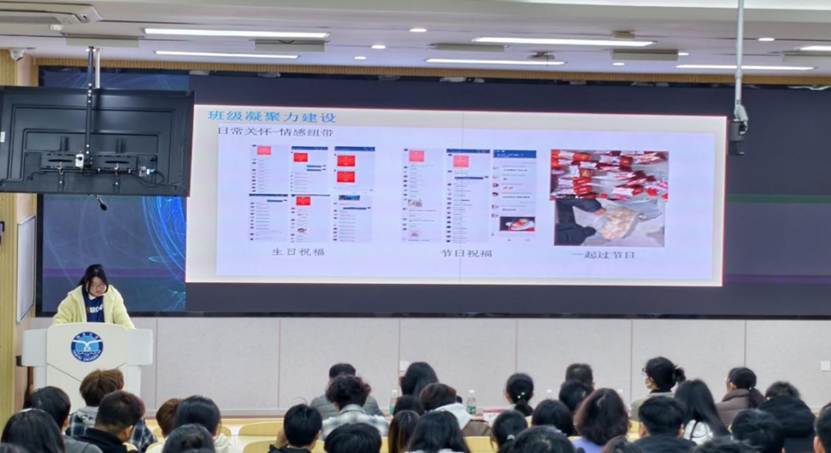 随后,邹丽佳老师宣读对及格率100%的班级应221-2班集体及个人进行通报表扬的表彰文件,该班学风浓厚,同学学习态度端正、刻苦努力、互帮互助,班级整体成绩优异,上一学期考试及格率100%。随后应221-2班班长李冉从班级学情分析、学风建设举措、每学年学习规划等方面进行经验分享。