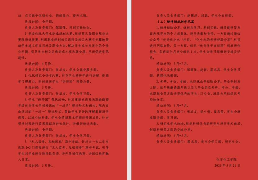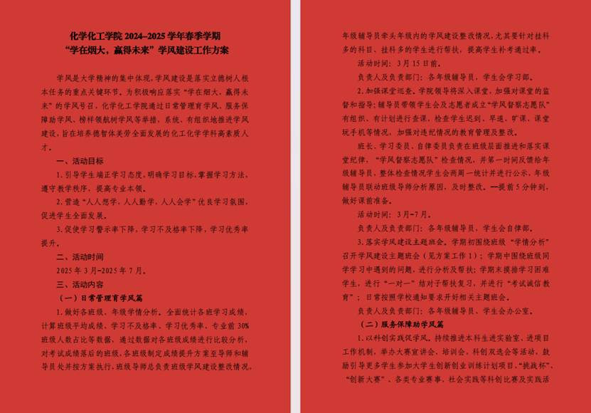 接下来,化院将通过开展课堂巡查、学风建设主题班会等日常管理育学风;召开科创宣讲会、培训会,举办化院大学生职业规划大赛、化院模拟小讲堂比赛、学生“讲师团”帮扶活动、“无人监考,互相阅卷”期中考试等服务保障促学风;组织各类榜样经验分享,考研、考公、考编、求职就业经验分享以及研究生学术论坛等活动榜样领航树学风,系统、有组织地推进学风建设,营造“学在烟大,赢得未来”的浓厚氛围,培养德智体美劳全面发展的化学化工学科高素质人才。