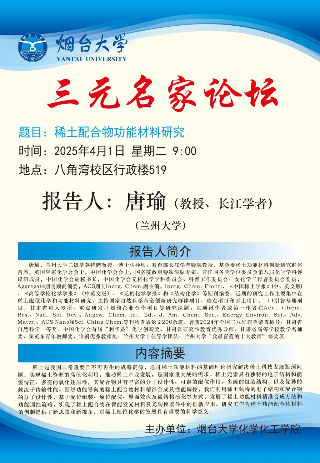 三元名家论坛(化院)丨《稀土配合物功能材料研究》,主讲:唐瑜教授