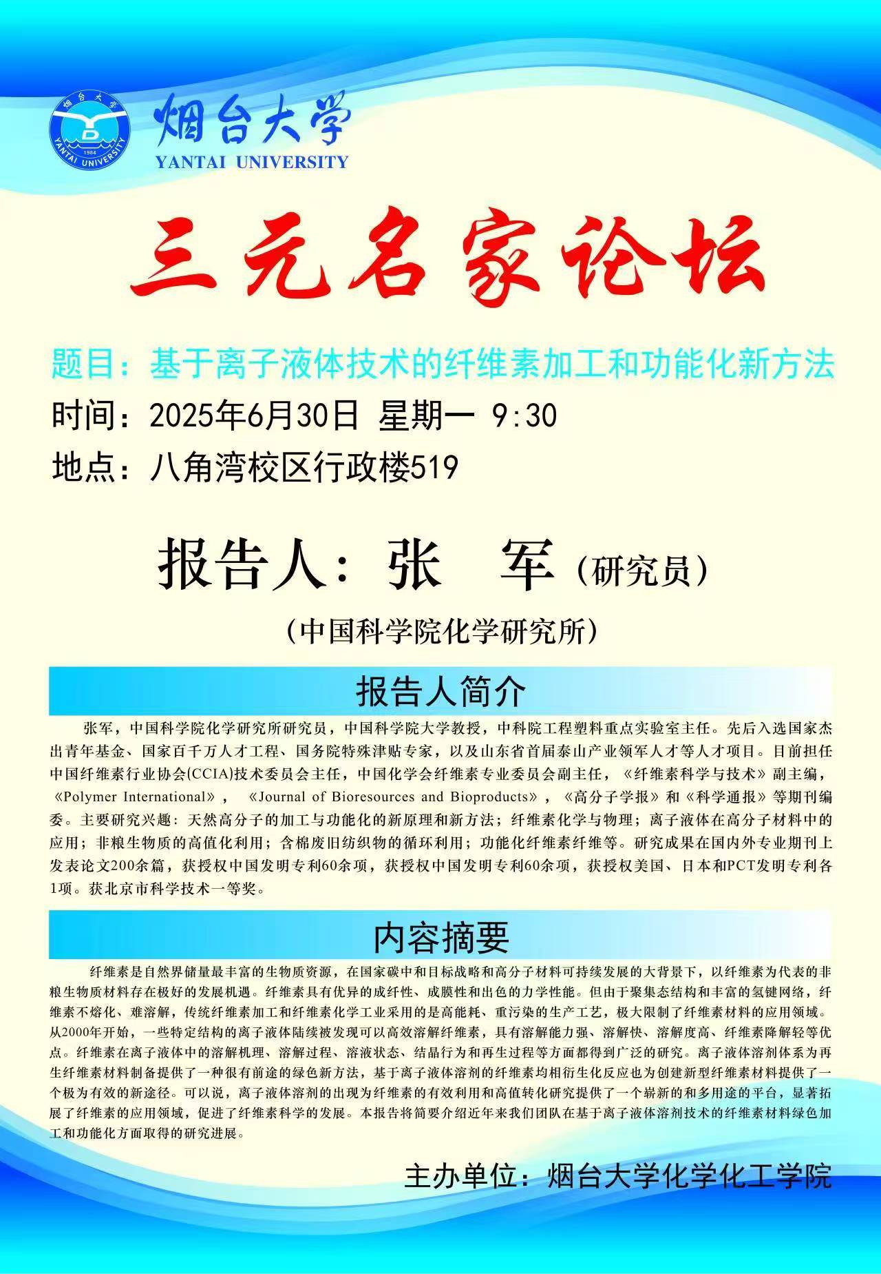 三元名家论坛:基于离子液体技术的纤维素加工和功能化新方法
