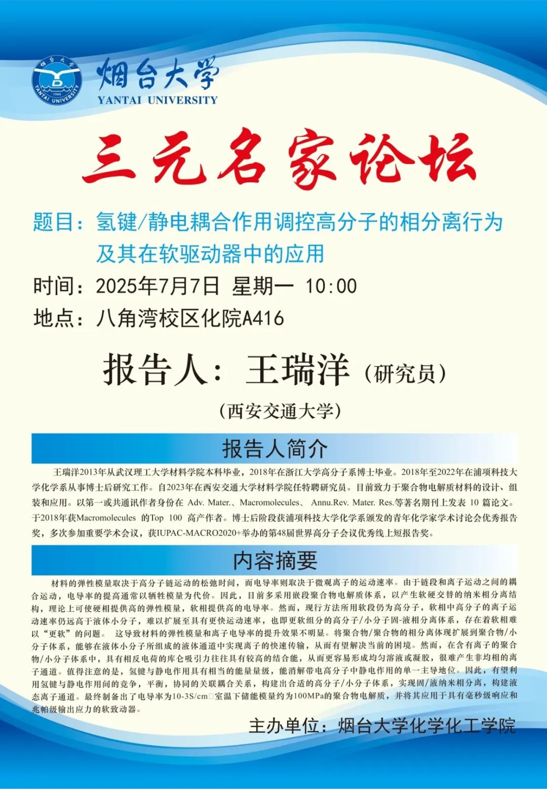 学术讲座 | 氢键/静电耦合作用调控高分子的相分离行为及其在软驱动器中的应用