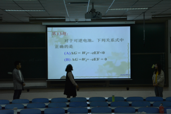 在比赛开始前,金明善老师邀请化153的郭志浩同学为17级同学加油。比赛现场,同学们满含热情,认真答题,认真思考,在金明善老师的带领下,参赛选手发挥自身真实水平,比赛题目更是接近生活,如“用清水洗完脸后,觉得脸有些绷紧,这说明人脸的表面张力比水的表面张力大或者小”。更是有轻松欢快的复活赛,优秀考研代表的考研分享,多种多样的出题模式,金老师秉承着给予学生更多锻炼机会,挑战自身的原则,让参赛同学有更多机会参与挑战赛,体验物理化学学科的乐趣与社会意义。