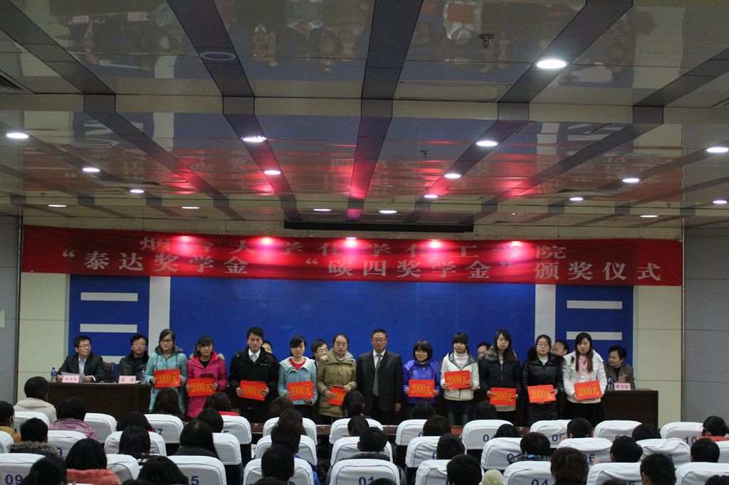 关于颁发2011-2012年度“泰达”奖学金的决定》。烟台泰达集团董事长宋华西先生向获得“泰达”奖学金的获奖同学颁奖并合影留念,与会领导向获得“碳四”奖学金获奖同学颁发了获奖证书,孙春阳同学和贾兵同学分别代表获奖学生发言。烟台泰达集团董事长宋华西先生以“不怕困难、不怕挫折、不怕出头、不怕失败、不怕吃苦、不怕低头“的“六个不怕”精神激励广大同学,要勇于面对困难,发奋图强,争做国家栋梁之才。随后,副校长邓昌亮发表讲话,他首先感谢泰达集团和碳四分离项目课题组的慷慨善举,在我校设立奖学金,并对色情小说