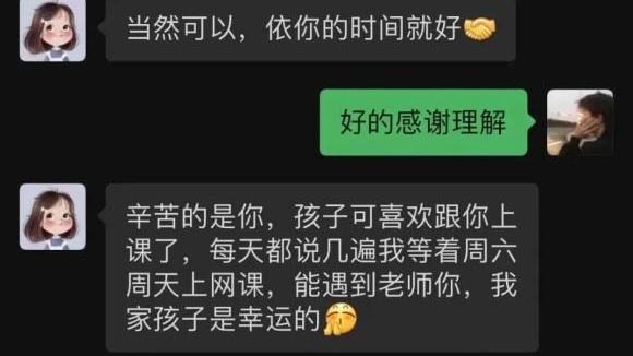 寒假期间的网上授课,是一段不平凡的经历。刚开始准备见面视频时我十分紧张,后来我与两个孩子相处融洽。授课的过程,不仅锻炼了我的教学能力,也给予了孩子学习上的帮助。未来虽不可见,但努力一定不会被辜负。