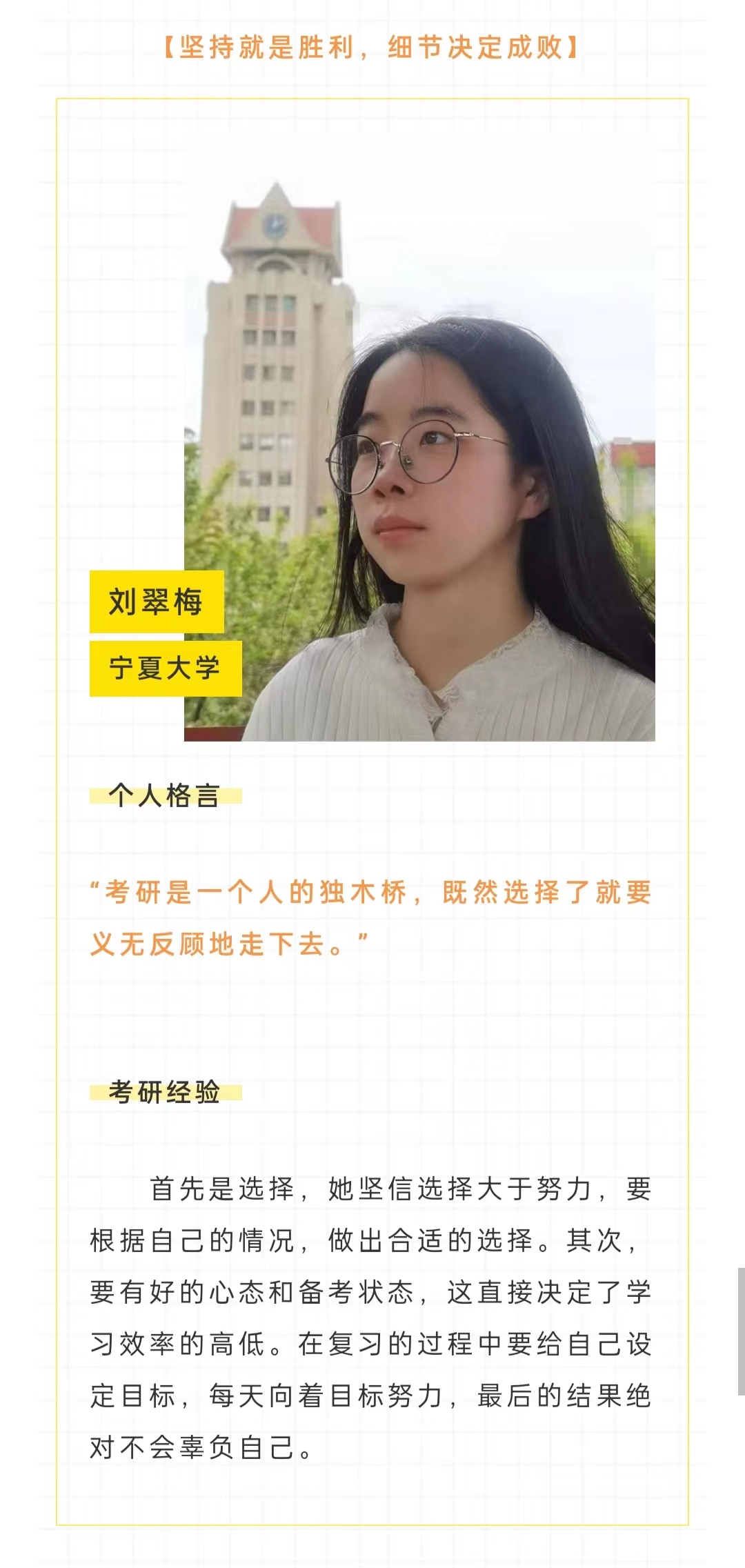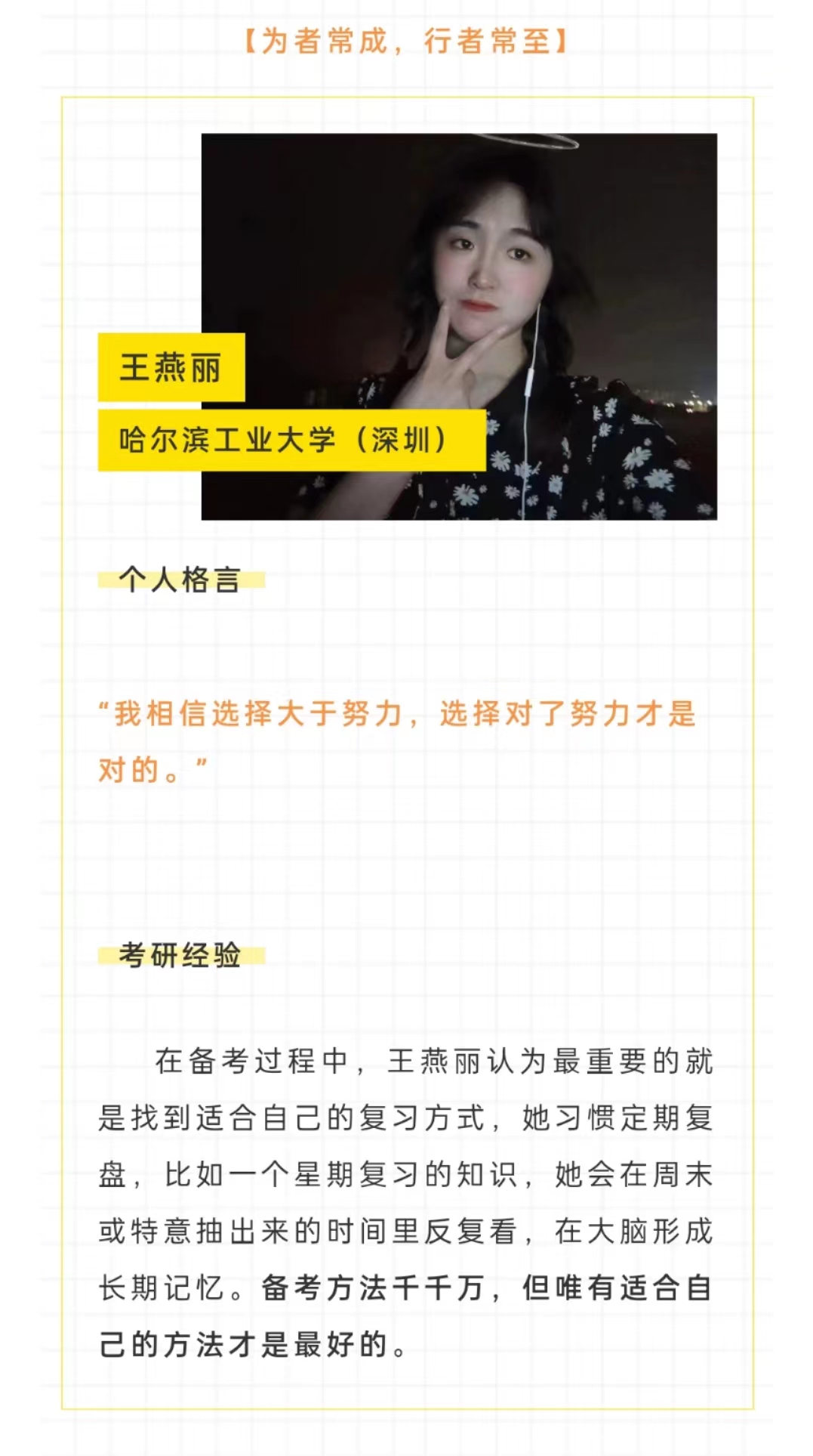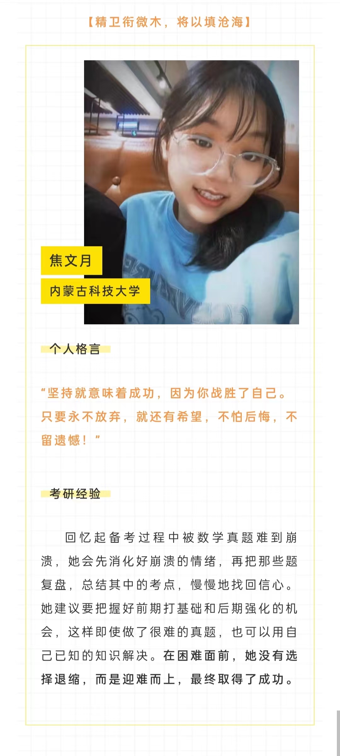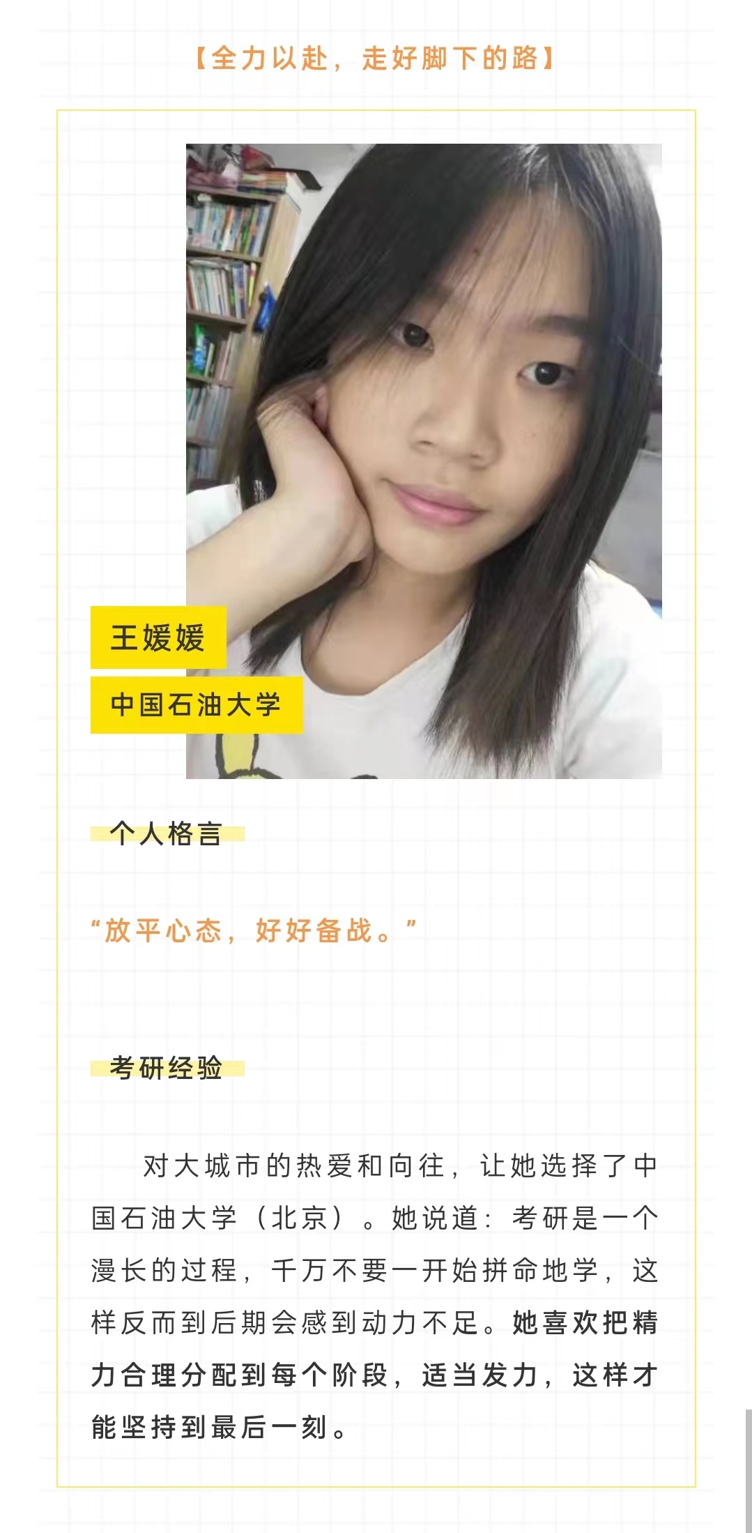 “骐骥千里,非一日之功。”考研是一场持久战,需要坚持不懈去努力,压力固然沉重,但绝不能被它搅乱平和的心态。当时因为疫情,暑假不能回家,无形的压力横亘在王媛媛心头,王媛媛一度严重失眠;焦文月某次做数学真题时备受打击,一度崩溃;王燕丽和王紫徽谈到在备考时,三教氛围紧张,后期几乎整栋楼都是低声背书的声音,人人心中都紧绷着一根弦……但她们都没有放弃,并且积极调整心态,在采访中她们谈及:“永远不要忘记初心,坚持到最后我们就赢了”、“只要坚持不放弃,一定可以上岸”、“把考研当成一个享受的过程,不要太在乎结果”。戒骄戒躁,放平心态,持之以恒扎实备考,这正是她们成功的法宝。