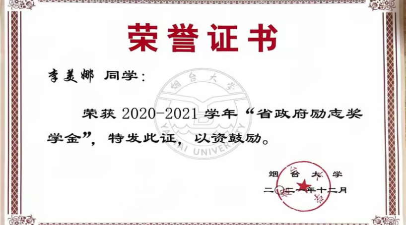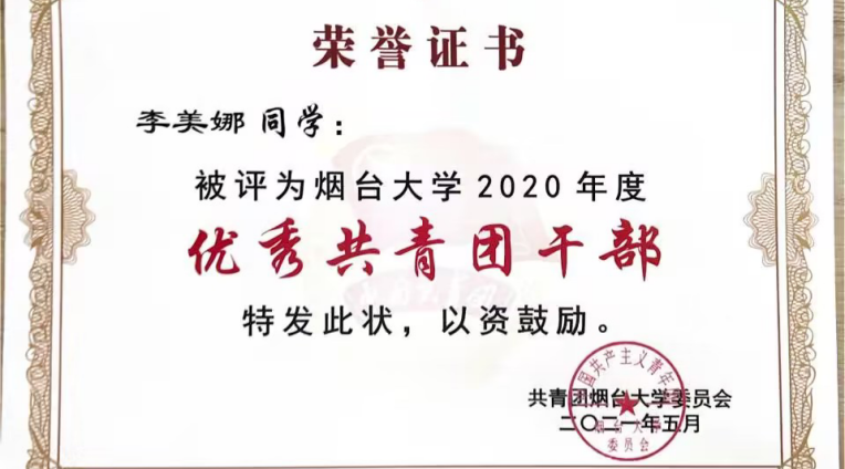 李美娜,曾任院团委采编部部长,现任化192-2团支部宣传委员,曾获2020-2021 学年“省级励志奖学金”、2019—2020 学年“优秀学生奖学金”,还积极参加科创比赛,获得奖项如下:第十七届“挑战杯”山东大学生课外学术科技作品红色专项活动省级二等奖、第九届大学生高分子材料创新创业大赛国家级三等奖、第二届山东省创新方法大赛省级一等奖、第十七届“挑战杯”山东省大学生课外学术科技作品竞赛省级二等奖、第十三届山东省大学生创业计划大赛省级二等奖、“大陆杯”第八届山东省高分子材料创新设计大赛省级三等奖、第七届色情小说