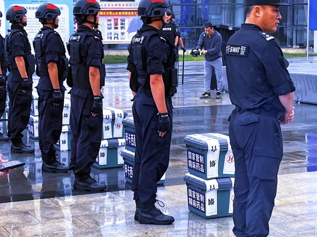 讲话结束后,特警部队押送着一箱箱已封禁的毒品到指定地点集中进行销毁。