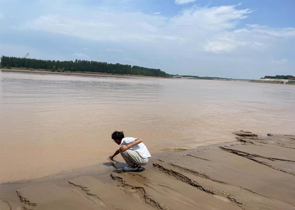 浑黄如浆的浪涛放荡不羁,波澜起伏的黄河汹涌奔腾。站在河畔,彼岸渺渺,没有船,没有桥,只能隐约看到远方,水天相连,模糊一片。脚下的黄河卷着漩涡,沉重地流淌。实践队于7月23日下午到达位于菏泽东明县的山东黄河“起点”,看到的便是这般景象。母亲河孕育了一代又一代的中华儿女,队员们更加坚定了实践的初心:检测黄河水,保护母亲河。实践队对河水进行了分段规范取样并做好标记,保证此后对水质的检测能够得到更加精确的结果。