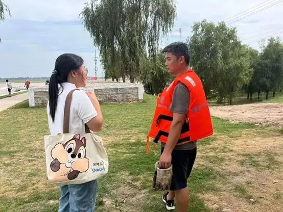 实践队成员应221-2李冉、应211-1赵胜楠同济南市槐荫区黄河河务局附近居民交谈。