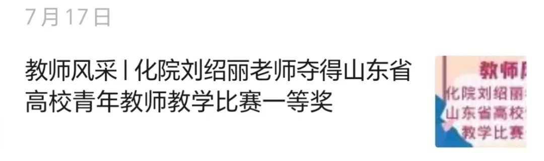 教师荣获山东省第十届高校青年教师教学比赛一等奖,实现我校理科教师在该项赛事中一等奖的突破。