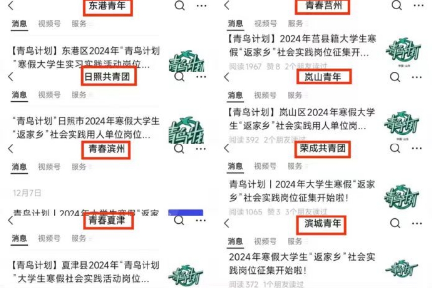 家乡公众号报名部分地区会通过团委公众号发布“返家乡”“三下乡”“青鸟计划”系列推文,介绍活动内容及要求,公布实习实践岗位。可以通过关注地方团委公众号,在规定时间按照要求报名参与寒暑期青鸟计划实习实践活动。