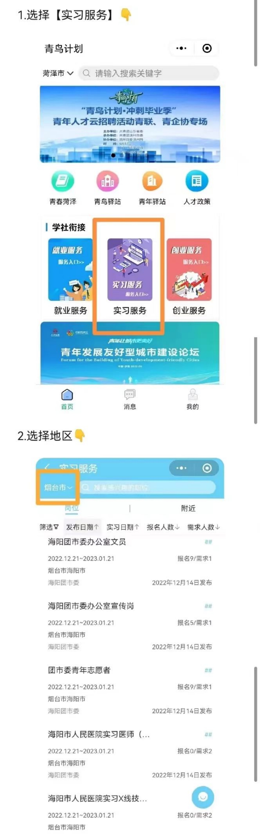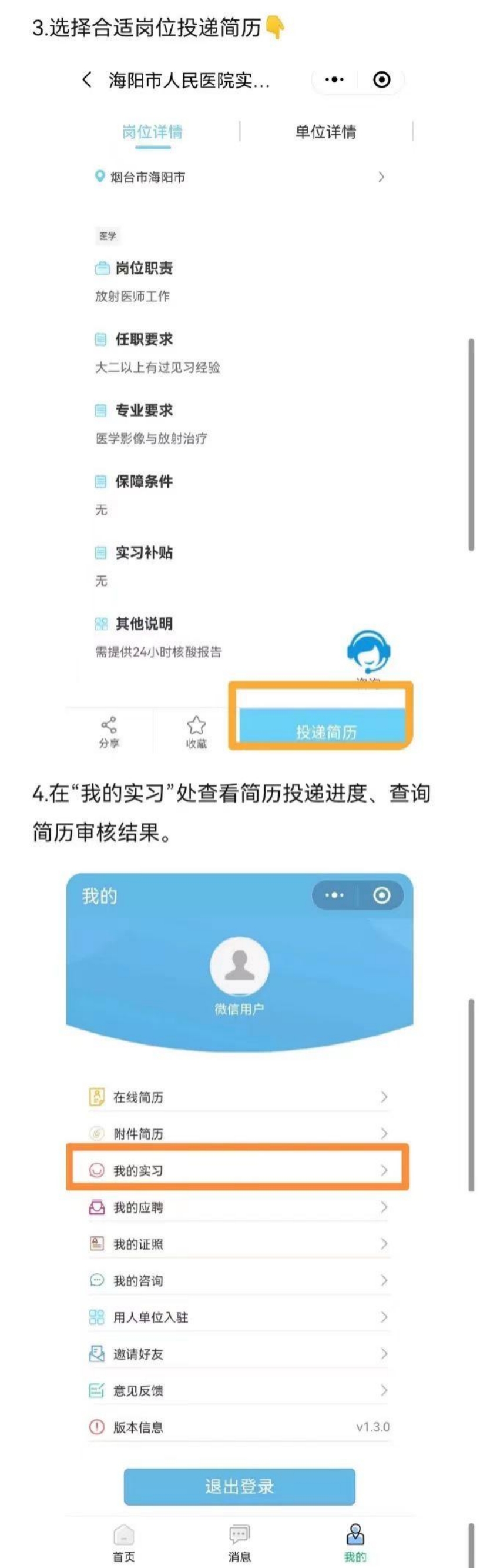 微信【“青鸟计划”小程序】→选择学社衔接中的【实习服务】→筛选【地区】→选择合适岗位,进行【投递简历】→【我的实习】查看投递状况。