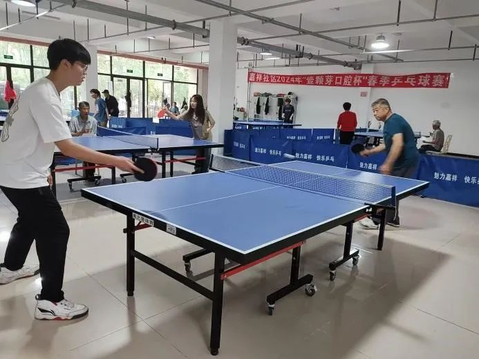 在嘉祥社区的乒乓球馆内,志愿者们与社区的中老年人们正进行着一场场活力四射的乒乓球比赛。