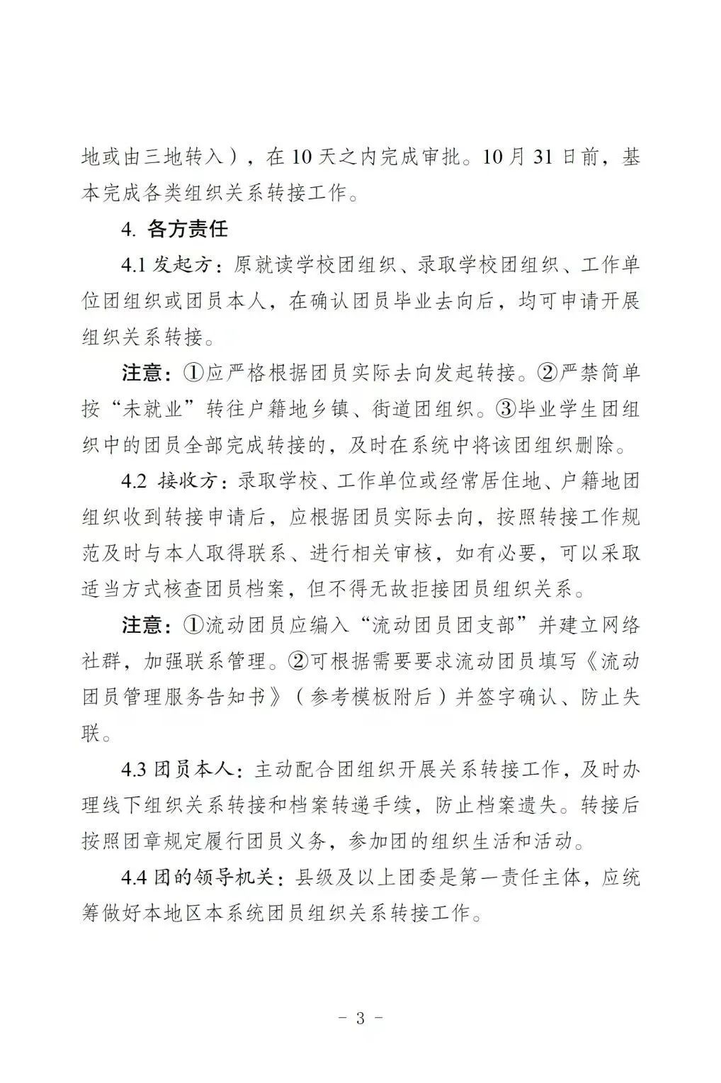 要以高度的责任心认真做好毕业学生团员的组织关系转接工作,熟悉政策规定和操作流程,为团员提供贴心服务。对于不符合转接规定的,要耐心解释说明,坚决防止和纠正“一拒了之”“一刀切”等简单化做法。