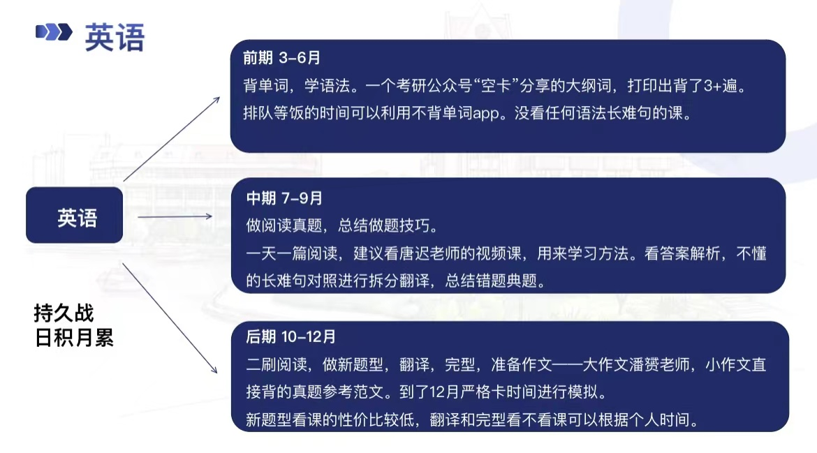 她深知数学的重要性,于是早早便开始准备。她选择的是武忠祥老师的网课,通过系统、全面的学习来夯实基础;此外,刷题是提升数学能力的关键,她建议一个模块一个模块开始练习,最后再做综合题。而整理错题则是最重要的环节,一定要确保自己真正掌握了每一个知识点。