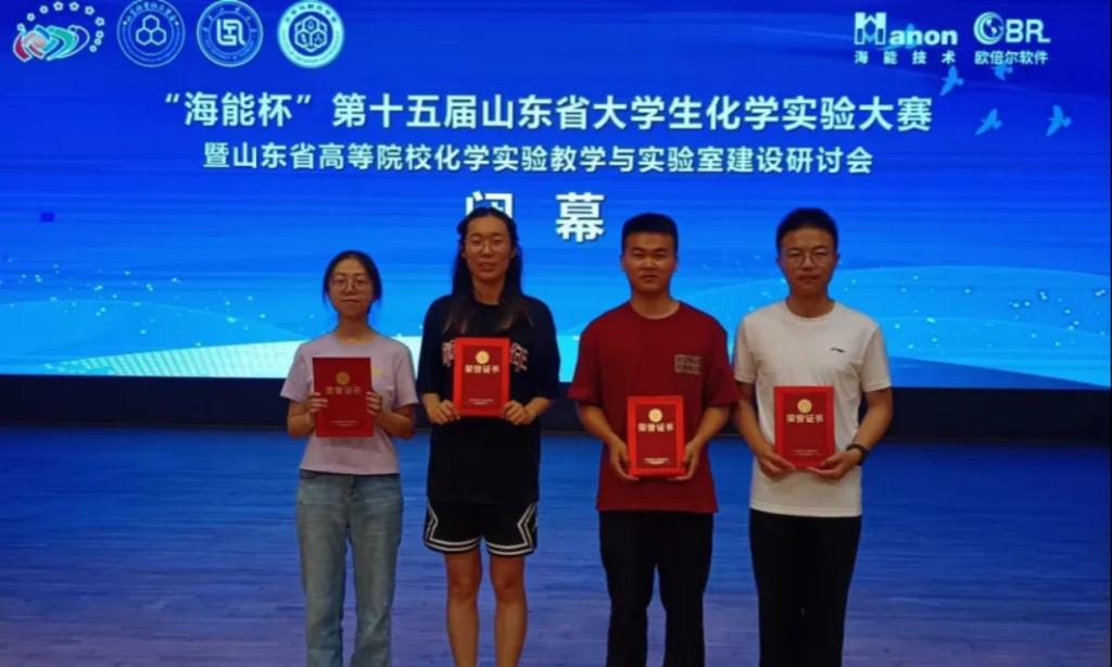 应用化学专业四名同学进入“海能杯”第十五届山东省大学生化学实验大赛决赛。在李文佐院长带队、刘义老师和杨昕老师指导下,经过理论和实验技能两天的激烈角逐,我校应用化学专业刘艳芮同学荣获大赛一等奖,袁福州和刘佳仪同学获得省级二等奖,蒋壮壮同学获得省三等奖。