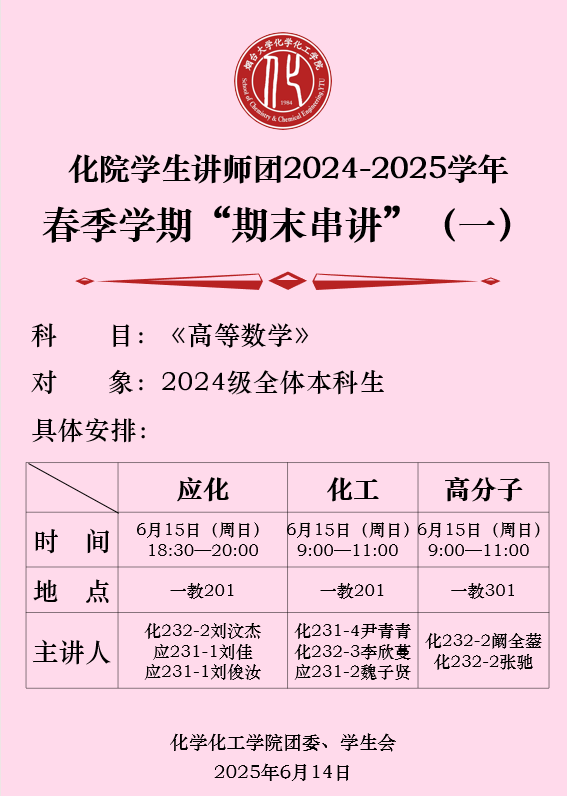 期末学业辅导 | 化院学生讲师团2024-2025学年春季学期“期末串讲”等你来(一)