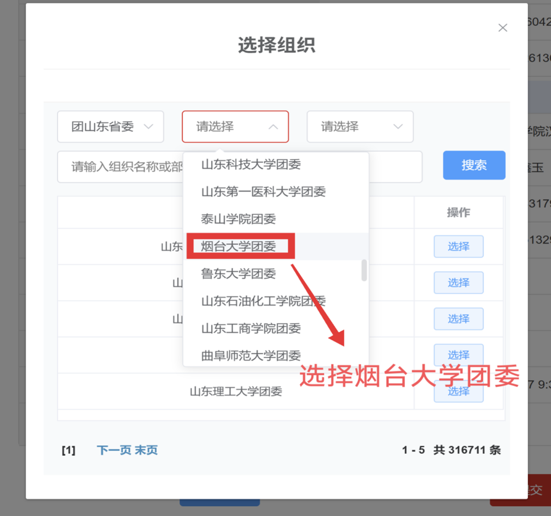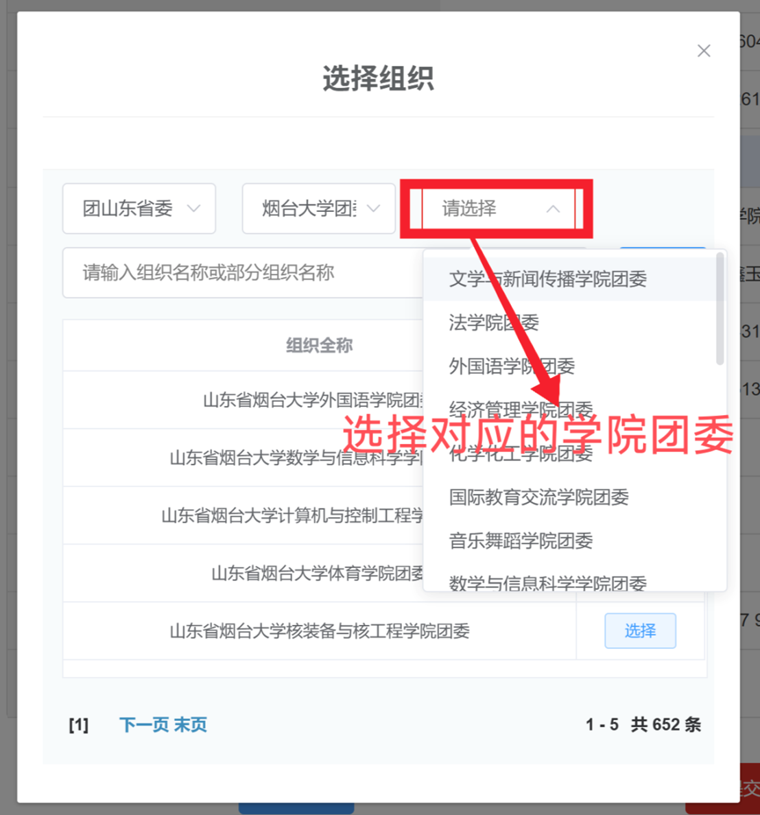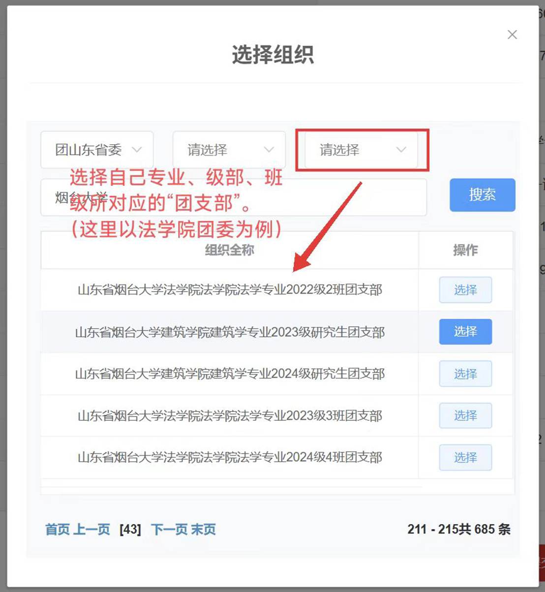 (5)在第三栏处选择“xxxx学院团委” 并选择自己专业、级部、班级所对应的“团支部”。(下图以法学院团委为例)