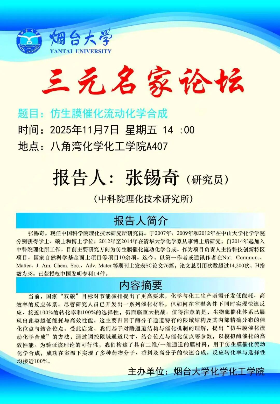 学术交流 | 三元名家论坛——仿生膜催化流动化学合成