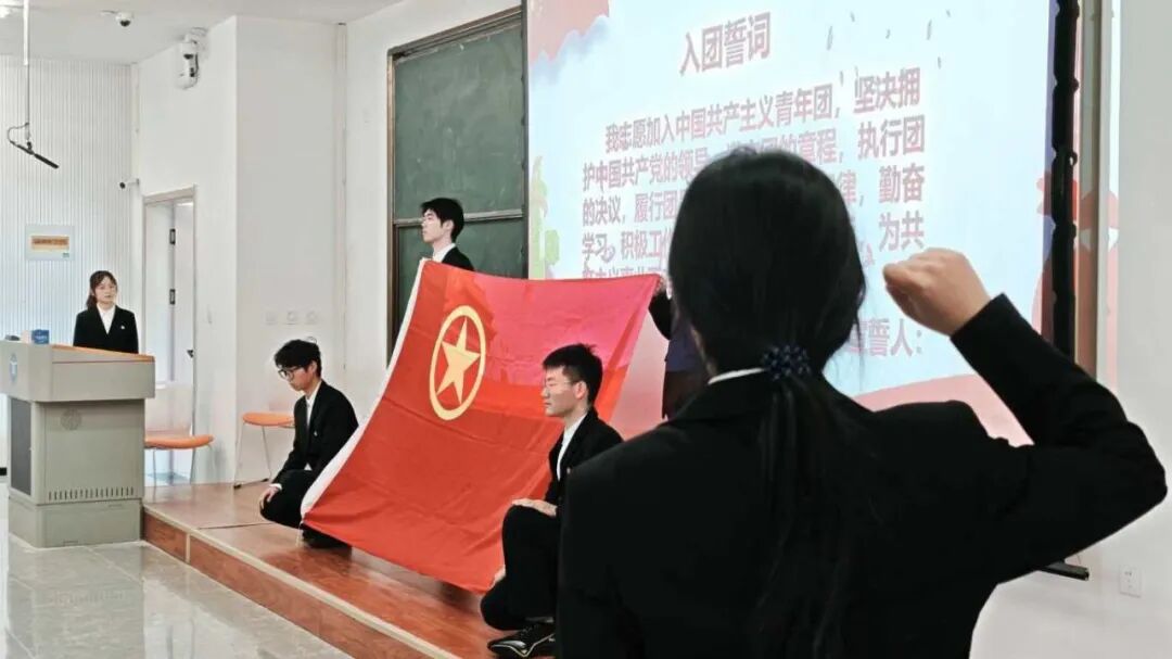 随后,全体新团员面向鲜红的团旗肃立致敬,高举右拳、目光坚定,在领誓人的带领下庄严宣誓。“为共产主义事业而奋斗”的誓言铿锵有力、掷地有声,字字彰显新时代青年的坚定信念,句句传递当代学子的蓬勃朝气与奋进力量。