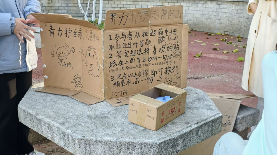 11月9日,应241-4、应241-5团支部将环保课堂“搬”至烟台南山公园,开展了以“‘青’力护绿,志愿南山”为主题的志愿服务活动。他们俯身清理草丛残屑、拭去长椅积尘,让公园角落重归洁净清朗;手绘的宣传海报鲜活醒目,纸板搭起的互动区更聚满人气——抽题箱里藏着“绿色化学”趣味知识,答题后的市民将环保心愿写在便签上,一句句质朴期许,把善意揉进了游园的烟火里。恰逢周末的南山公园人流熙攘,也让这份青春环保的心意,随秋风传向了更多角落。