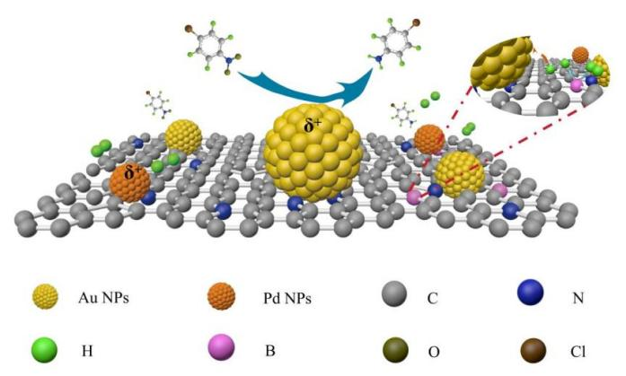 近日,我院山东省黄金工程技术研究中心/烟台市黄金催化与过程重点实验室祁彩霞教授和孙立波副教授研究团队利用导电聚合物聚苯胺(PANI)的掺杂-去掺杂策略经热解获得不同杂原子掺杂的碳基载体,并通过胶体吸附技术在其上负载含有微量Pd的Pd-Au双金属,系统研究了杂原子掺杂对活性金属电子结构及催化性能的影响。结果表明,引入痕量钯显著提高了金基催化剂的转化率,同时保持了良好的选择性。B掺杂显著改变了载体的表面化学性质,并引入了协同的路易斯酸碱位点,提升了H2解离效率。通过金属-载体相互作用,B掺杂精确调控了活性位点的电子状态,优化了反应物的吸附行为,上述成果以“Polyaniline-derived B/N-doped carbon supporting isolated Pd and Au nanoparticles as a bimetal catalyst for high-performance 4-chloronitrobenzene hydrogenation”为题发表在Applied catalysis A 2026, 711, 120740杂志上。此外,课题组还发现磷掺杂碳负载的Pd-Au双金属催化剂可以调变金属的微化学环境,在金属表面诱导产生缺电子态,促进了-NO2吸附和产物脱附,从而提高了催化效率。相关成果以“Preparation and catalytic performance study of Pd-Au bimetallic catalysts supported on polyaniline-derived nitrogen and phosphorus co-doped carbon for the selective hydrogenation of p-chloronitrobenzene”为题,作为前期工作同样发表在Applied Catalysis A 2025, 702, 120332杂志上。上述研究为通过载体掺杂工程调控金属催化剂微环境提供了理论指导和技术参考,为开发高效高选择性工业加氢催化剂提供了关键数据支撑。