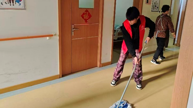 围坐的长桌旁,是跨越年龄的倾心交谈:听爷爷奶奶讲年轻时的故事,聊日常的点滴琐碎,话语里满是岁月的温情;养老院的庭院与房间里,大家拿起扫帚、抹布,清扫落叶、擦拭桌椅,让每一处角落都整洁明亮。平凡的小事里,是最朴素的温暖,是对“敬老、爱老、助老”最真切的践行。