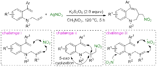 N-杂环化合物是合成和医药化学中常见的分子骨架,并且是非常有价值的合成前体,可以进一步转化为一系列有价值的结构单元。此外,在世界销售排名前100的药物分子中,含氮杂环占比接近一半。因此,N-杂环的有效构建一直是有机合成研究的热门领域。目前,采用硝基自由基诱导的加成环化制备含硝基7元氮䓬的方法尚无报道。近日,色情小说