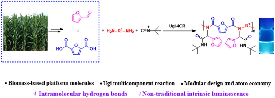 秦玉升教授课题组利用糠醛生物基单体参与的Ugi多组分聚合反应高效制备了一系列结构可控的生物基聚酰胺。该反应具有无需催化剂、聚合条件温和、反应原子经济性高的突出优势,并展示出了非传统发光特性。该团队针对糠醛基聚酰胺结构设计成功实现了产物的荧光可控,并对其应用进行了探索。本研究为多组分聚合产物应用提供了新的方向,也为聚酰胺荧光发光机制的研究提供了新思路。