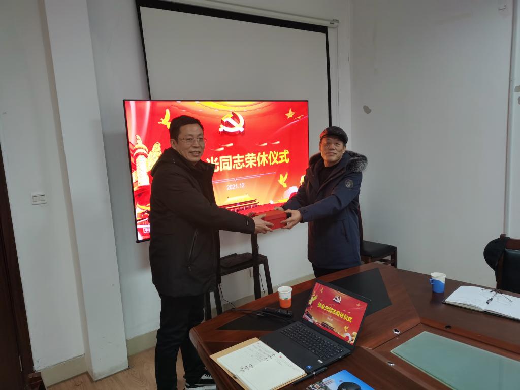 段志国书记介绍了徐金光老师在学院的工作经历,向徐金光同志致以诚挚地感谢和崇高的敬意,感谢他多年来为学院发展做出的贡献,在感谢与祝福的同时希望他继续发挥光与热,关心学院的发展。随后,段志国书记代表学院为徐金光老师赠送了特别刻制的纪念品。