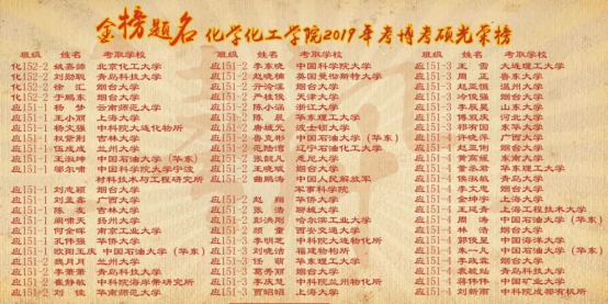 就有198名同学成功考取研究生,考研录取率达40.66%,97名同学被全国985、211重点高校及国家级重点科研院所录取,名校录取率高达49%,其中包括考取浙江大学2人、天津大学2人、吉林大学2人、华东理工大学3人、大连理工大学3人、中国科学院大学12人、北京化工大学14人、中国石油大学23人等。