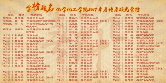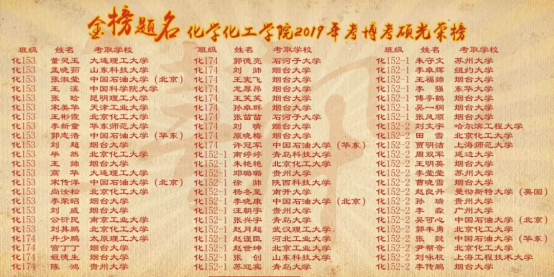 希望所有考上研究生的同学们都能够在未来学业中学有所成,在各自研究的领域中做出贡献,为烟大争光,为化院争彩。希望所有正在准备考研的同学们能够持之以恒,坚持到底,祝福未来金榜题名。希望所有大一、大二的同学们以此为榜样,脚踏实地,好学力行,梦想成真!