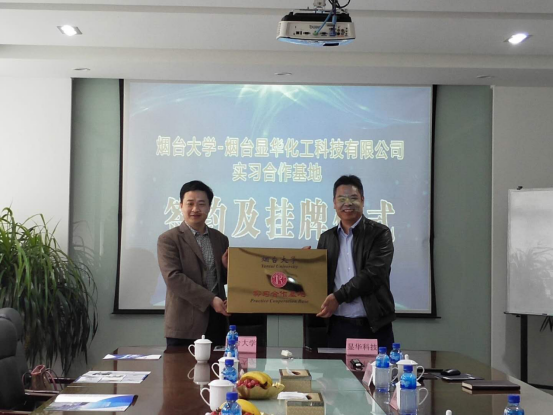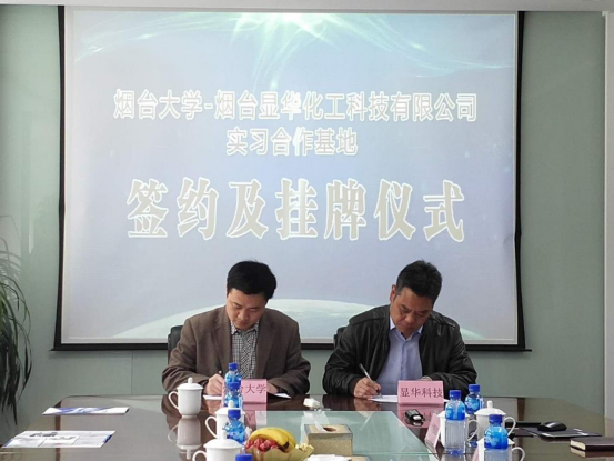 实习合作基地建设协议书”,并进行授牌仪式。烟台显华化工科技有限公司各相关部门负责人,学院教师何涛、李兴存、李家柱、林清泉、杨树斌出席仪式。