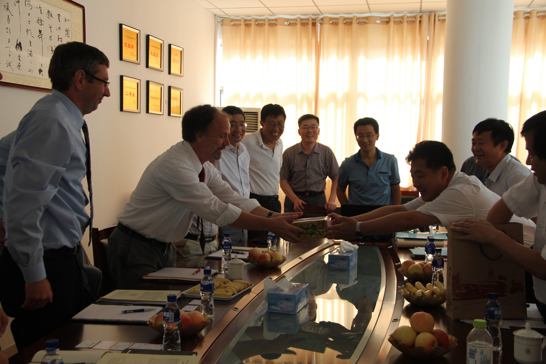 826日,德国赢创工业集团全球计划部副总裁Helmut Brueggemann博士与高级项目工程师Andreas Wolff博士一行四人来我校进行化工科研合作洽谈,副校长孙祥斌代表学校会见了德国客人,化院领导和虞乐舜等碳四课题组全体成员、我校客座教授姚亚平研究员一同参加了技术交流会。