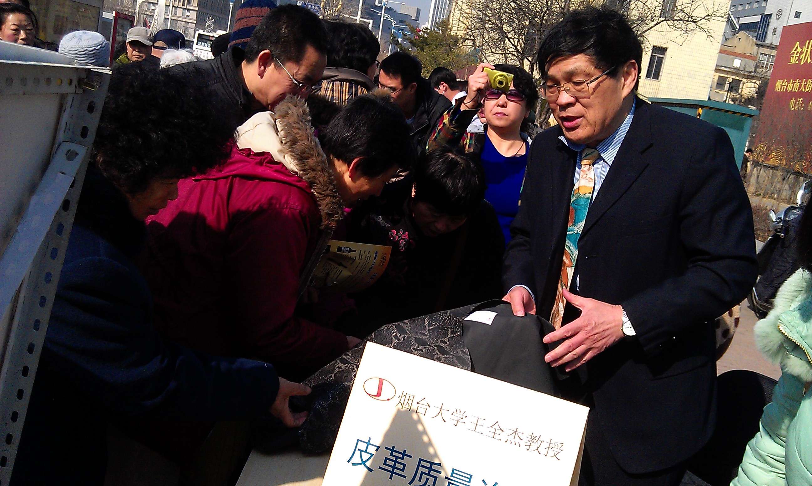 皮革专家王全杰教授来到现场后,消费者将自己七八十元购的手套、三四千元的皮包等申请鉴别皮革质量;有位市民干脆把鞋子脱了递给王全杰请他看看到底是猪皮还是牛皮;还有老太太把自家貂皮大衣带来请王全杰鉴别损坏程度;所城里的刘大爷带来了家里存放多年的皮衣求教怎么清除皮衣上的霉斑,他拉着王教授的手说“咱是老朋友了,2001年‘315’请你鉴别过皮鞋,帮我讨回了公道,这次欢迎你还带了这么多学生”。王教授仔细鉴别,并耐心的传授给消费者皮革鉴别的小窍门。研二志愿者王闪闪说:“这次‘315’活动,王老师现场教会我们大学生如何走向社会,如何为市民服务,受益匪浅!”。