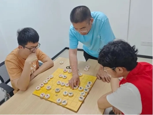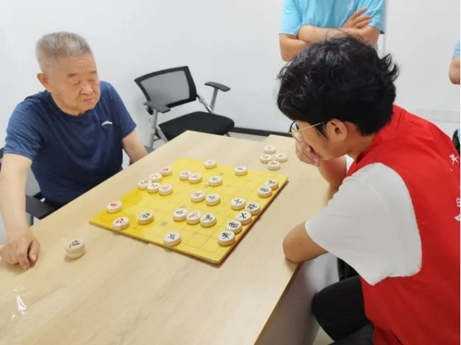 在社区活动室的一角,几张象棋桌旁,志愿者们与社区的大爷们正展开了一场场智慧与策略的对决。棋盘上,楚河汉界分明,黑红两军严阵以待,每一颗棋子的落下都似乎带着历史的回响。“姜还是老的辣!”老人们展现出了深厚的棋艺,志愿者们却是虚心请教,乐在其中。
