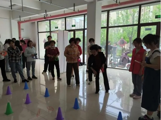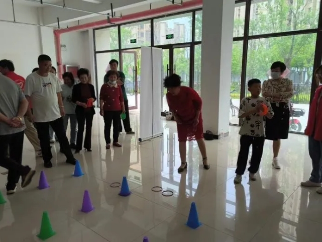 活动室的另一处,一场套圈游戏正在上演,志愿者们与社区的老人们共同参与这场充满童趣的活动,笑声和欢呼声此起彼伏,温暖了整个空间。