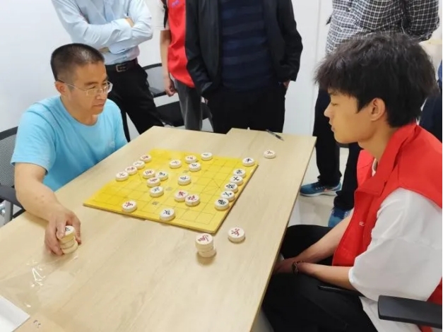 志愿者李庆洋眉头微蹙,正与一位眼神锐利的大爷对弈。大爷执红先行,以一记当头炮拉开战局,小李则沉着应对,以屏风马稳固防线。棋盘上,双方你来我往,攻守转换间,气氛既紧张又和谐。围观的老人们不时低声讨论,或点头赞许,或摇头惋惜,每个人都沉浸在这一场思维的博弈中。