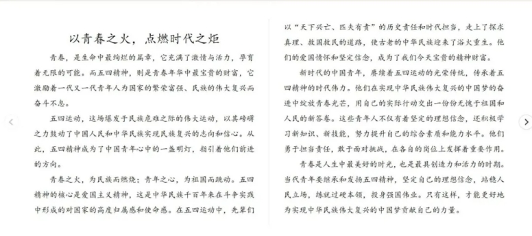 征文大赛于5月4日开始征集作品,院团委理论学习部对所有参赛作品进行匿名编号,大赛成立由老师和同学们共同组成的评委会对作品进行打分。参赛者们以五四精神为内核,结合自身的成长经历、感悟与思考,撰写出一篇篇充满激情与力量的文章。他们从不同角度、不同层面阐述了五四精神的时代价值与现实意义,展现了青年知识分子在爱国奋斗中的坚定信念与执着追求。