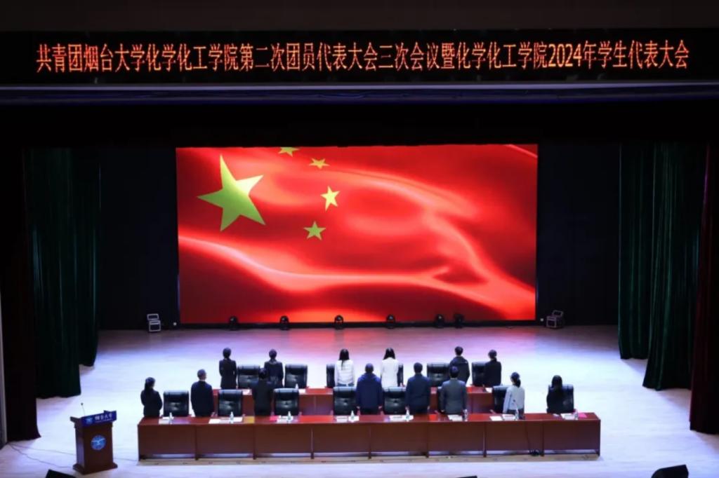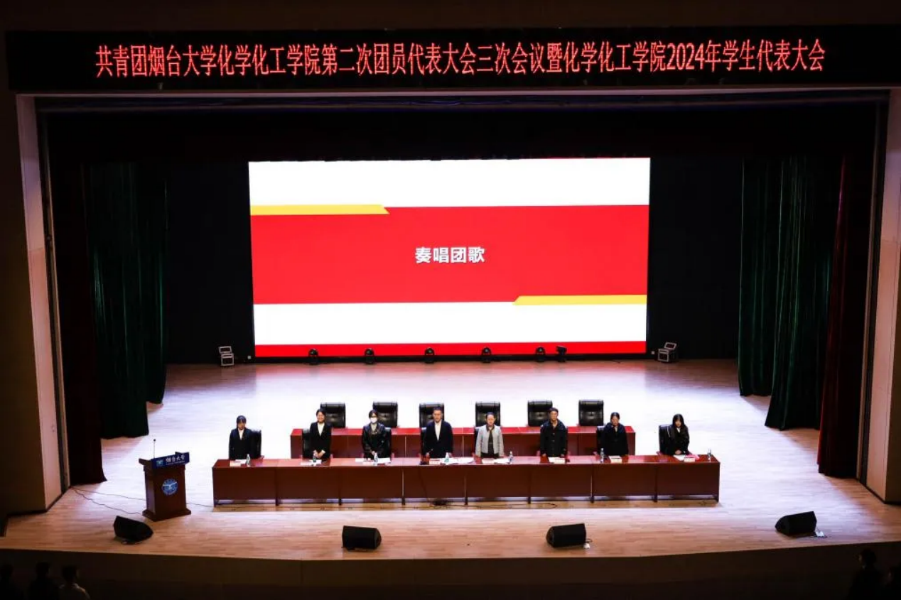 2024年学生代表大会在八角湾校区文化艺术中心大礼堂举行。学院党委副书记胡大鹏老师、校团委陈鹏飞老师、校研究生会代表张晓聪同学、校学生会代表刘译泽同学,八角湾校区其他学院研究生会和本科学生会主席团代表以及化院辅导员老师、博士兼职辅导员老师、导师代表等与二百五十多名团员、学生代表出席本次会议。