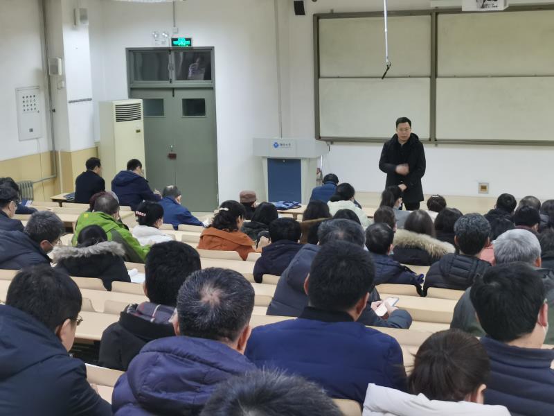 在七教204召开全院教职工大会。10:30,学院通过腾讯会议召开了全体学生干部大会。全院教职工大会由党委书记段志国主持,全体学生干部大会由团委书记张婷主持。